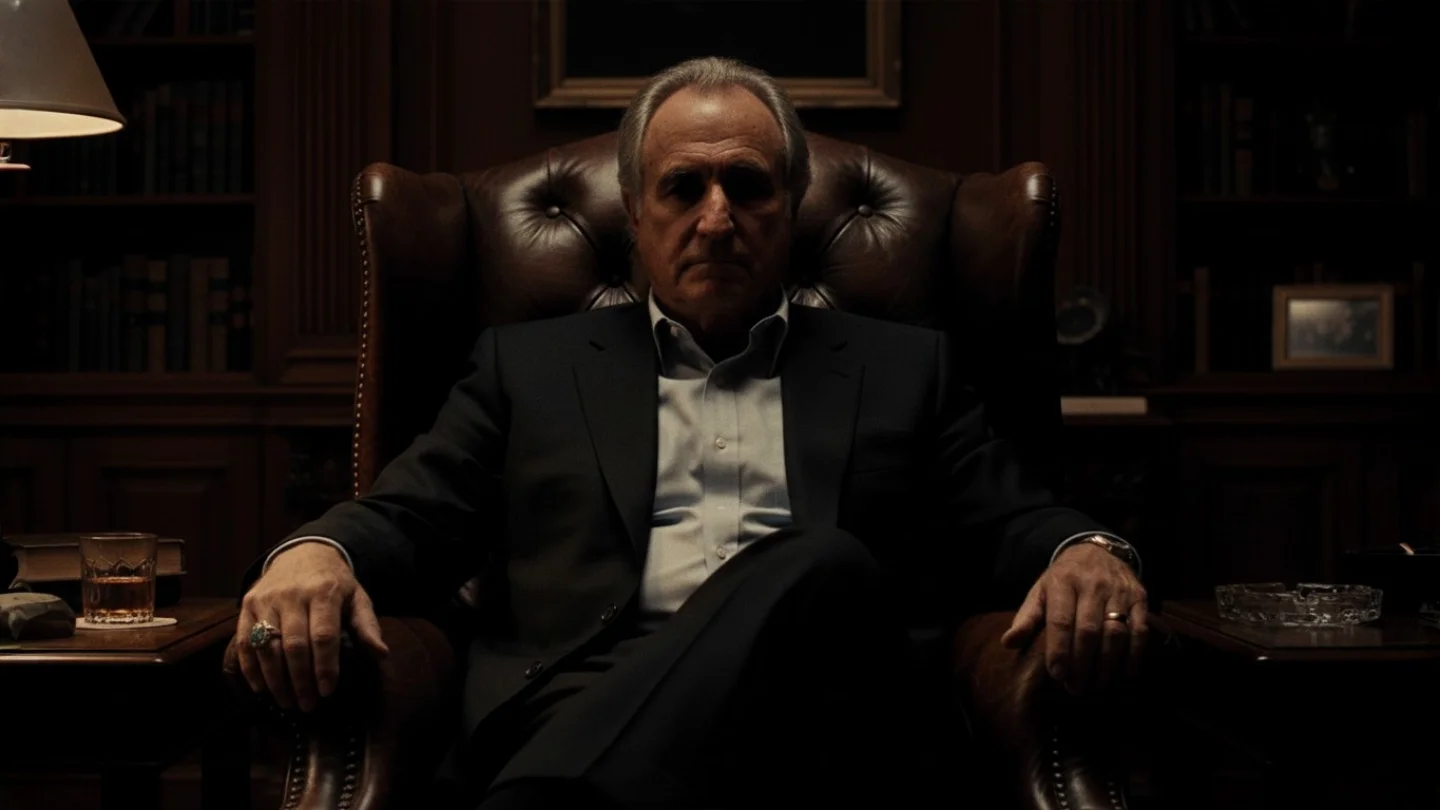 A cinematic, "Godfather" style portrait of Bernie Madoff, the cold mastermind of the Bernie Madoff Ponzi scheme, seated in a dark, shadowy armchair.