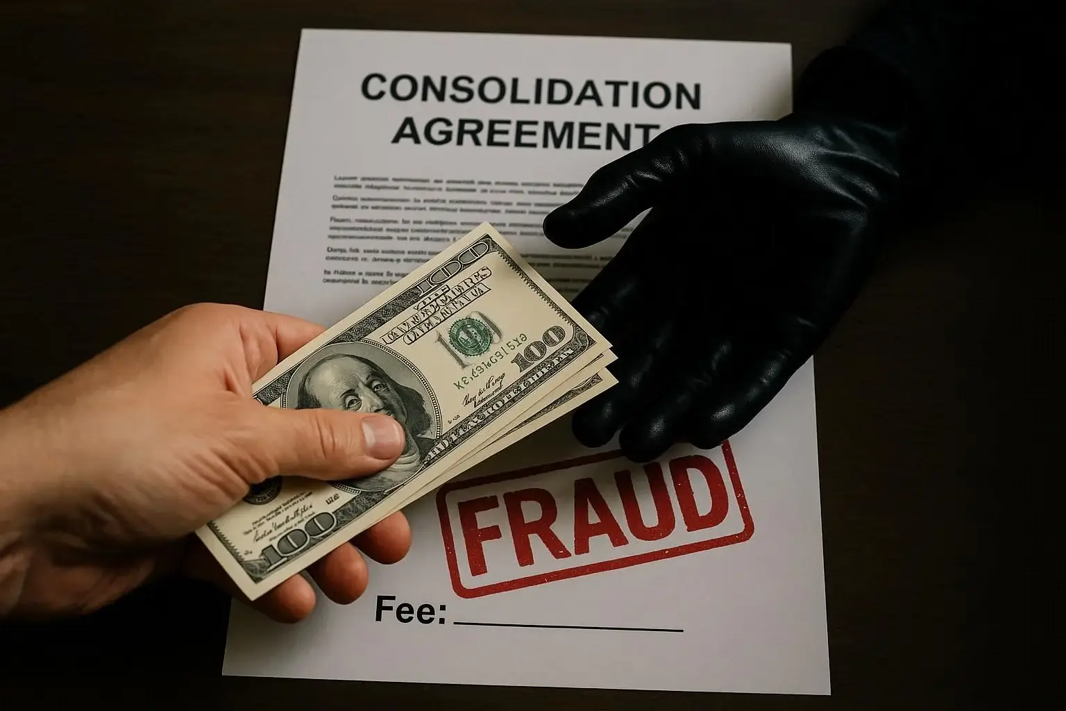 A consumer's hand giving cash to a black-gloved hand over a "Consolidation Agreement" stamped with FRAUD, symbolizing the advance fee trap of debt consolidation fraud.