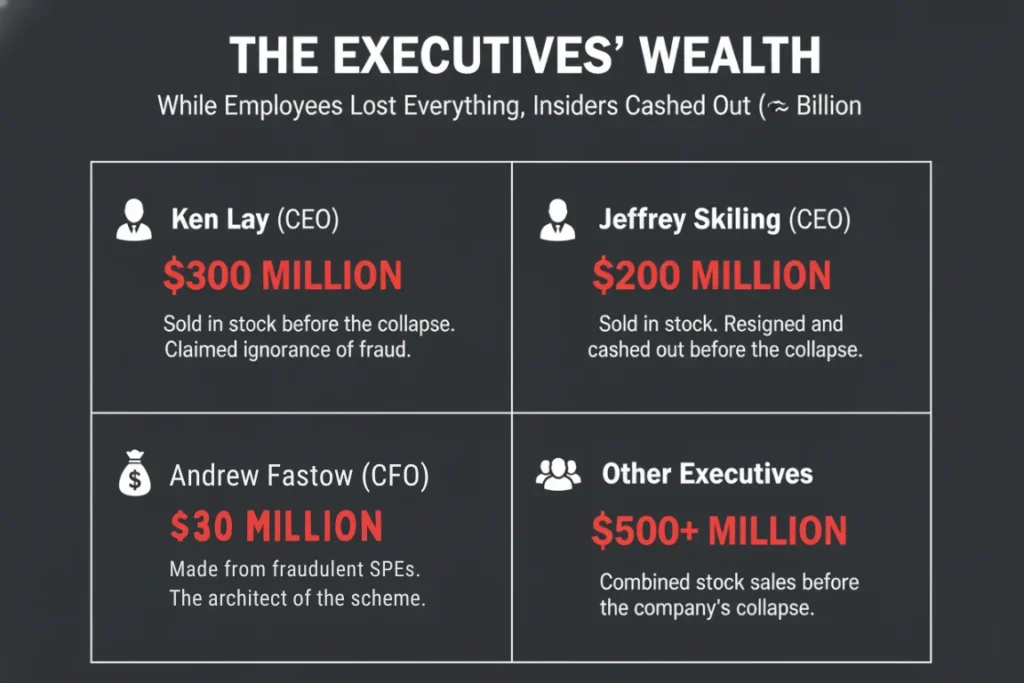 20,000 employees paid the price. They worked hard. They believed in management. They invested their retirement in company stock. Then they watched it become worthless while executives sold billions.