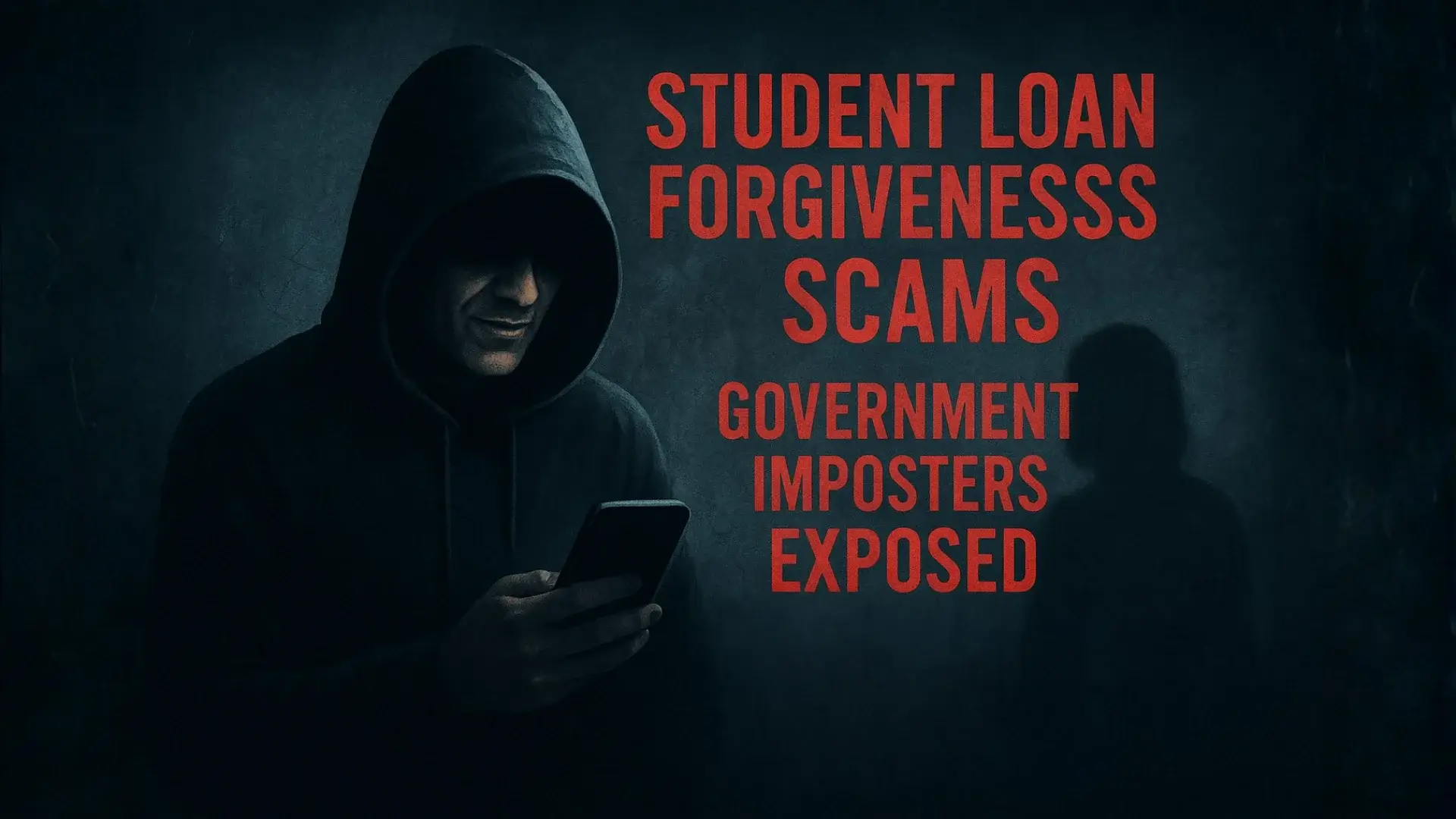 A dark, hooded figure smiling while looking at a phone, juxtaposed with the text 'STUDENT LOAN FORGIVENESS SCAMS: GOVERNMENT IMPOSTERS EXPOSED', representing the threat of loan fraud.